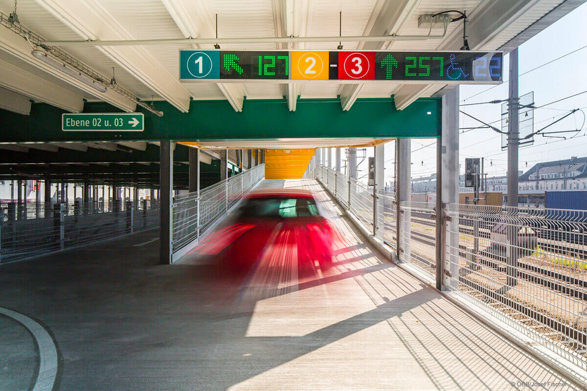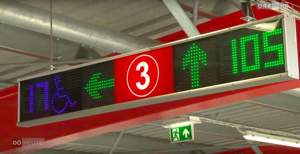 Klare Leitsysteme zur Steuerung des Auto- und Fußgängerverkehrs erhöhen das Wohlbefinden Ihrer Parkhaus-Nutzer. Die dynamische Führung „pro Platz“, „pro Zone“ oder „pro Ebene“ zu freien Parkplätzen erleichtert die Navigation.